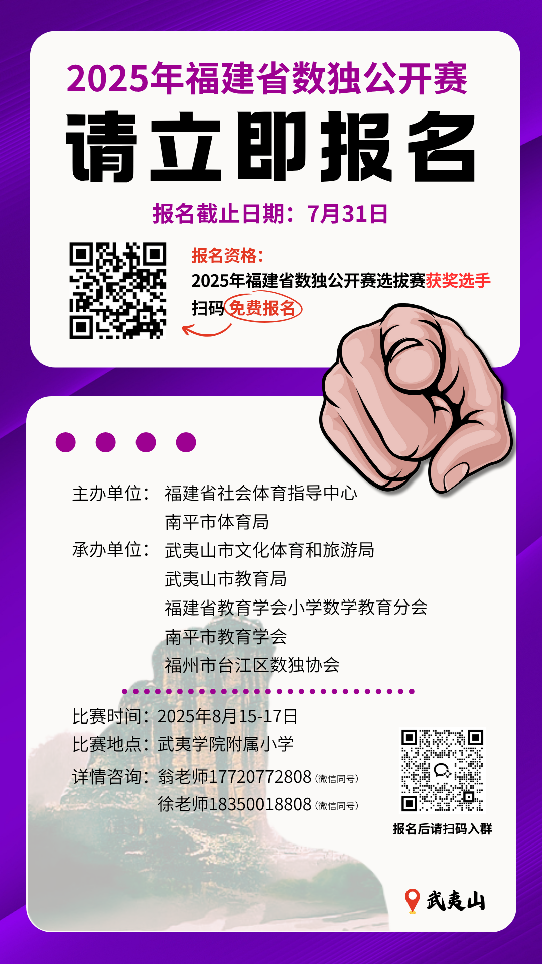获奖选手可免费参与由福建省社会体育指导中心和南平市体育局联合主办的2025年福建省数独公开赛,请尽快扫码报名,确认资格。
